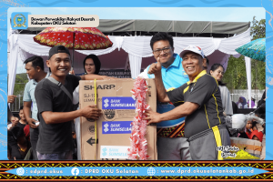 H.A Ismail MO, SKM., M.Kes mewakili Ketua DPRD OKU Selatan meberikan salah satu hadiah utama berupa Kulkas kepada peserta yang beruntung.
